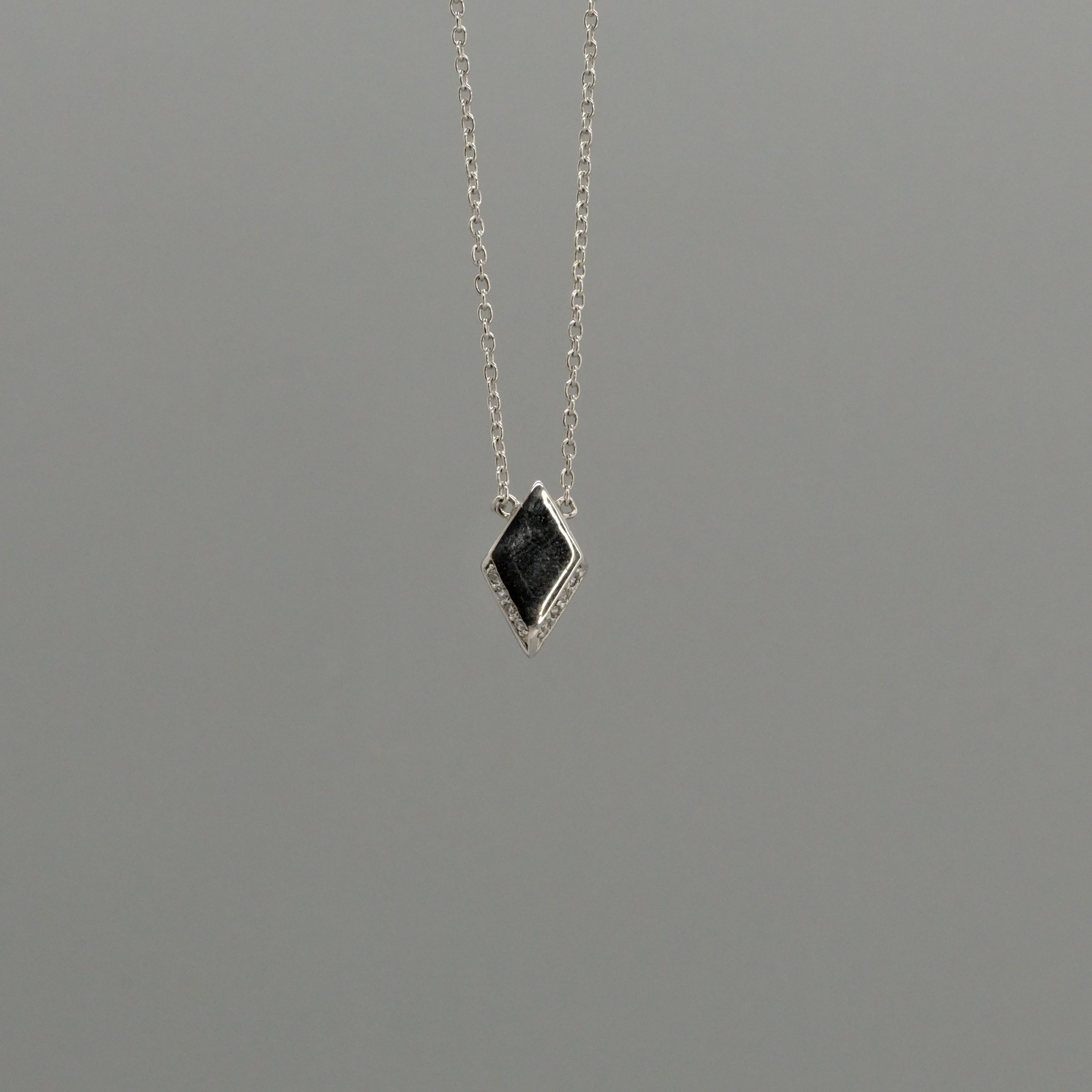 A sleek and modern piece, this necklace features a striking diamond-shaped pendant framed in polished sterling silver. Its minimal, geometric design brings a bold yet effortless touch to any outfit. Perfect on its own or layered, this 18" necklace adds just the right amount of edge and elegance to your everyday style.