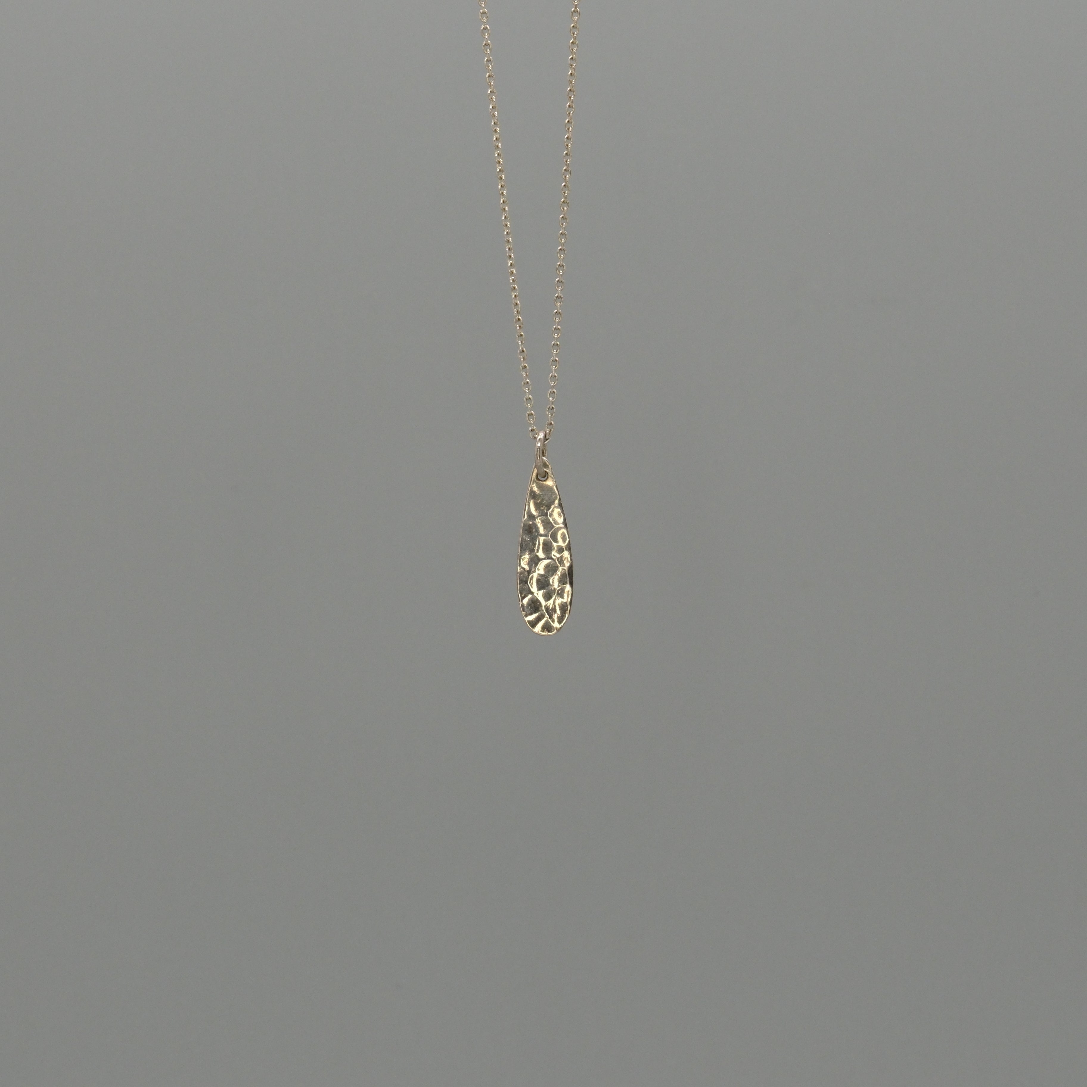 A delicate teardrop pendant with a shimmering hammered texture that catches the light from every angle. This elegant drop design hangs gracefully from a fine chain, creating the perfect balance between minimalism and artisan charm. Lightweight, versatile, and subtly eye-catching, it’s ideal for everyday wear or effortless layering. 18" long.