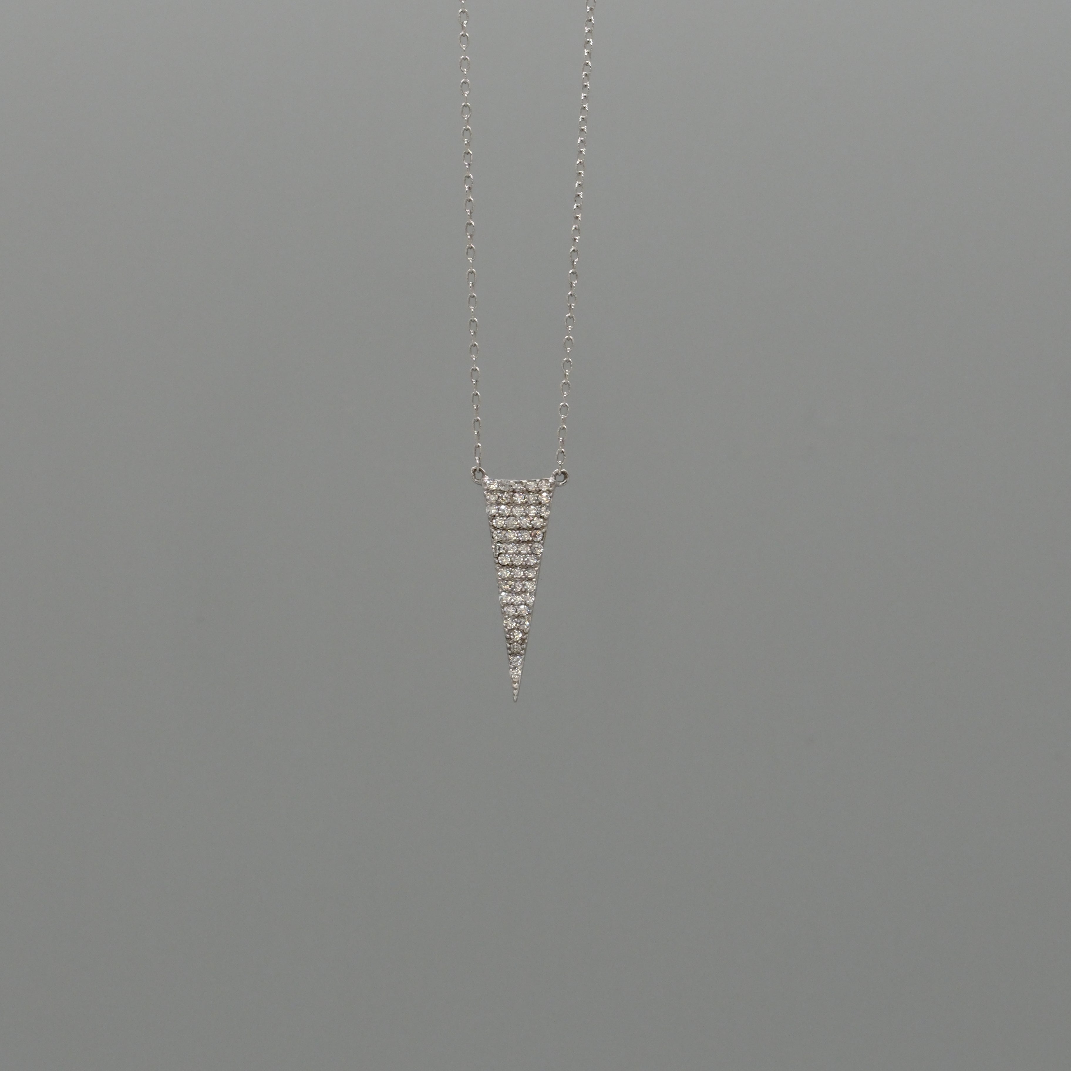 Add a touch of edgy sparkle to your everyday look with our Frosted Spike Pendant. This sleek, elongated triangle is paved with shimmering cubic zirconia, catching the light with every movement. Set on an 18" sterling silver chain, it blends modern minimalism with a bold, fashion-forward vibe, perfect for layering or wearing solo.