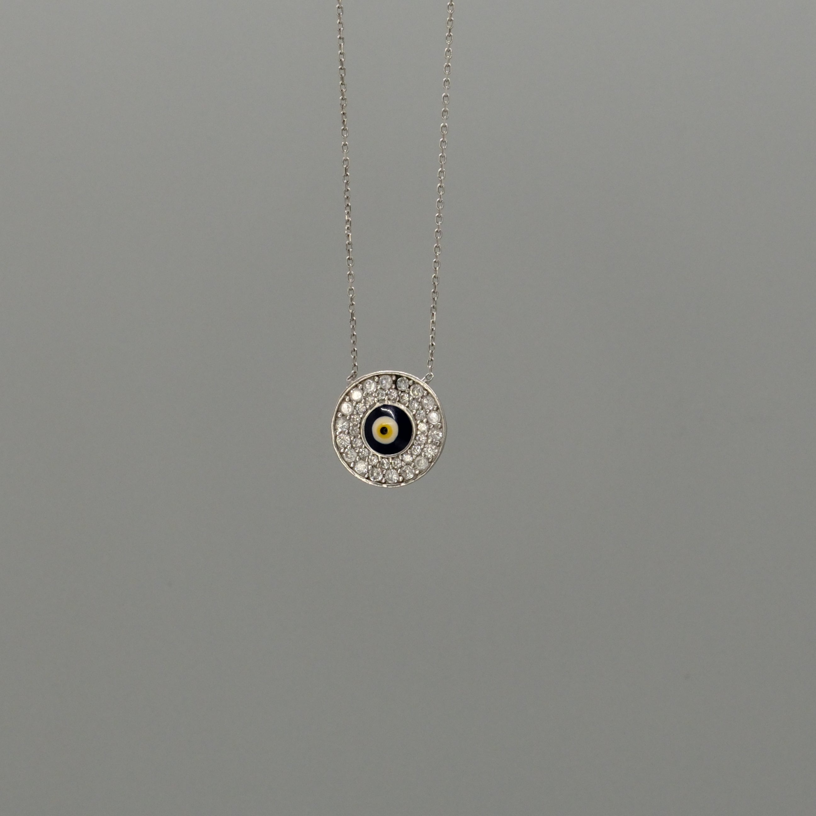 Protective, stylish, and full of sparkle, this Evil Eye Necklace features a classic glass evil-eye charm framed by a halo of shimmering cubic zirconia. Set on a delicate silver-toned chain, it brings both elegance and symbolism. Designed to ward off negativity while elevating your everyday look, this piece is perfect for layering or wearing solo. A meaningful accessory you can wear daily. 18" long.