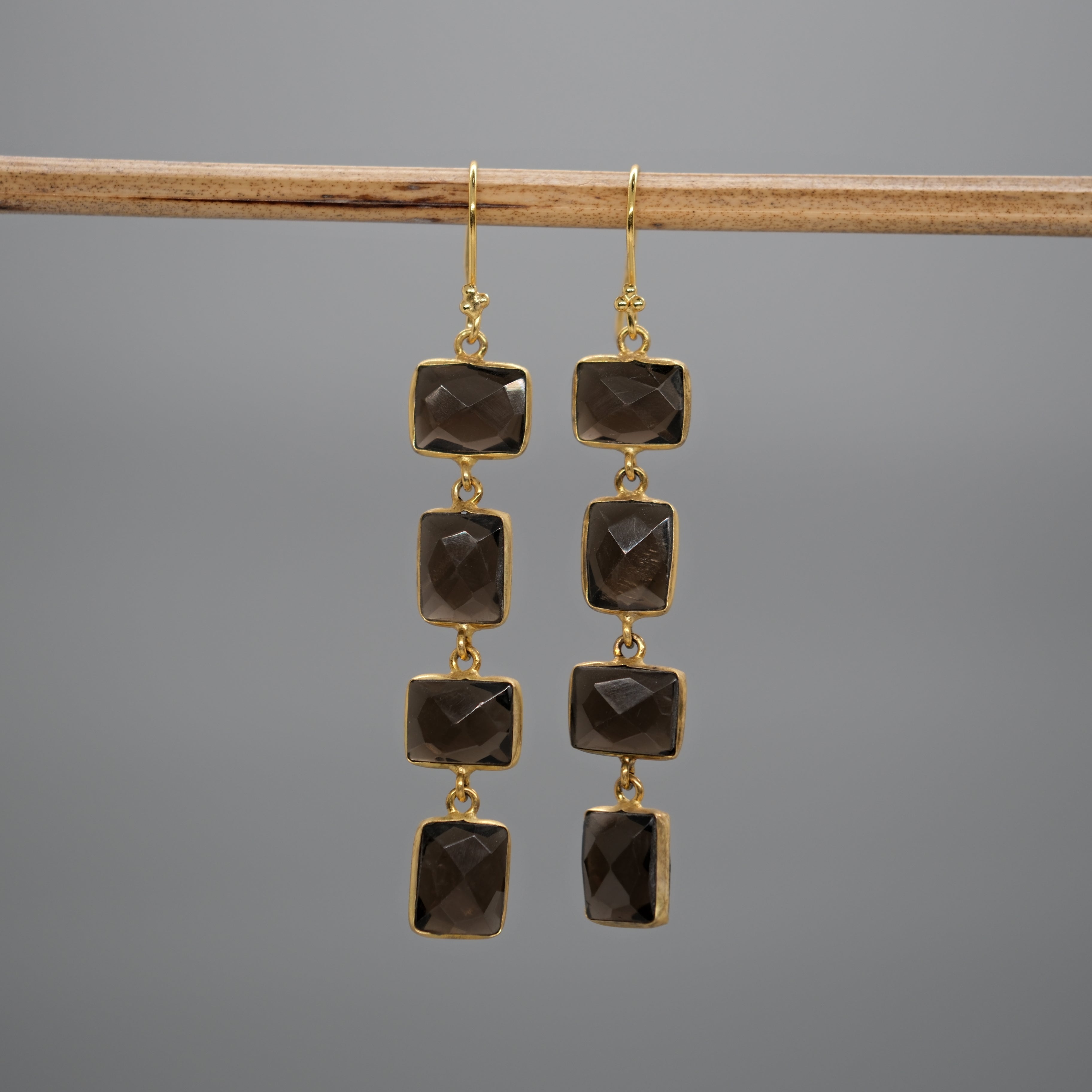 These statement earrings feature a striking cascade of faceted smoky quartz, each stone bezel-set in 14k gold plated over sterling silver. The geometric silhouette adds a modern edge, while the warm gold and deep, moody quartz create a beautifully rich contrast. Elegant, elongated, and full of movement, perfect for both evening wear and elevated everyday style.