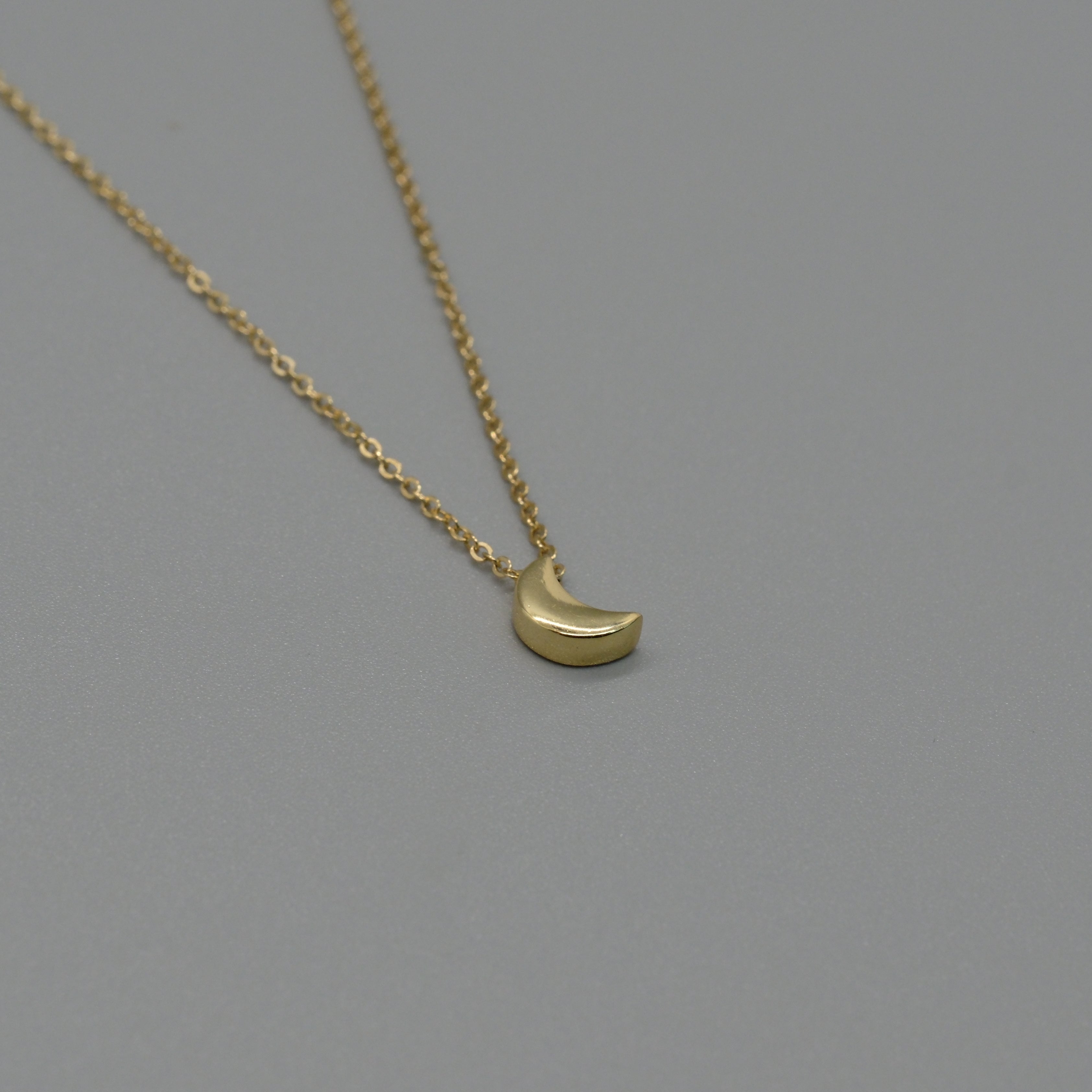 A dainty crescent-moon pendant crafted in 14k gold-plated silver, suspended from a delicate chain for effortless everyday elegance. Its minimalist silhouette shines with a soft, polished glow—perfect for layering or wearing solo. A timeless symbol of intuition and femininity, this 18" necklace adds a subtle celestial charm to any look.