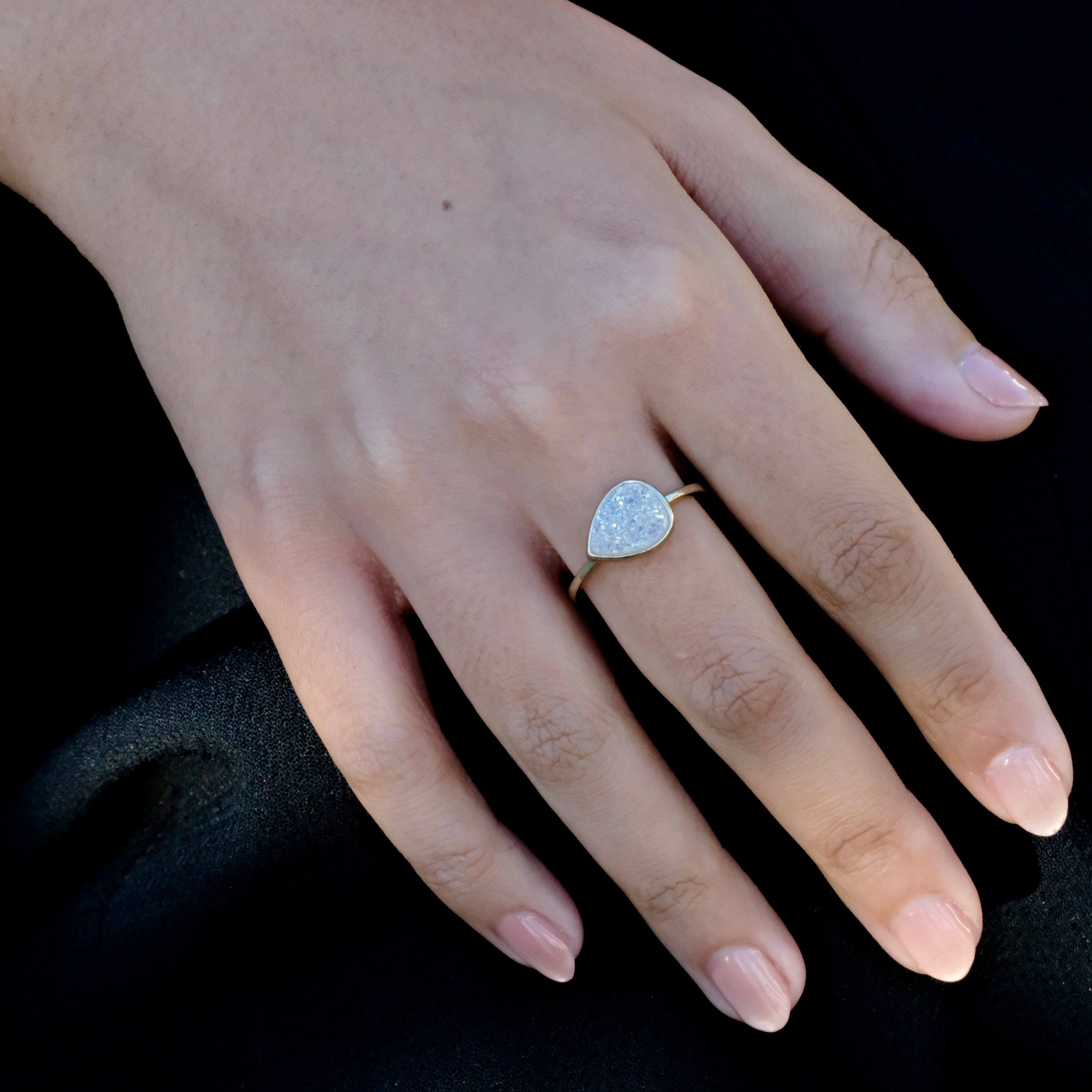 Shimmering and eye-catching, this elegant ring features a teardrop-shaped druzy-style center with a sparkling textured finish. The glittering surface catches the light beautifully, adding a touch of radiance to any look. Set in 14k gold-plated sterling silver with a sleek, minimalist band, this piece offers both everyday wearability and a hint of glamour.