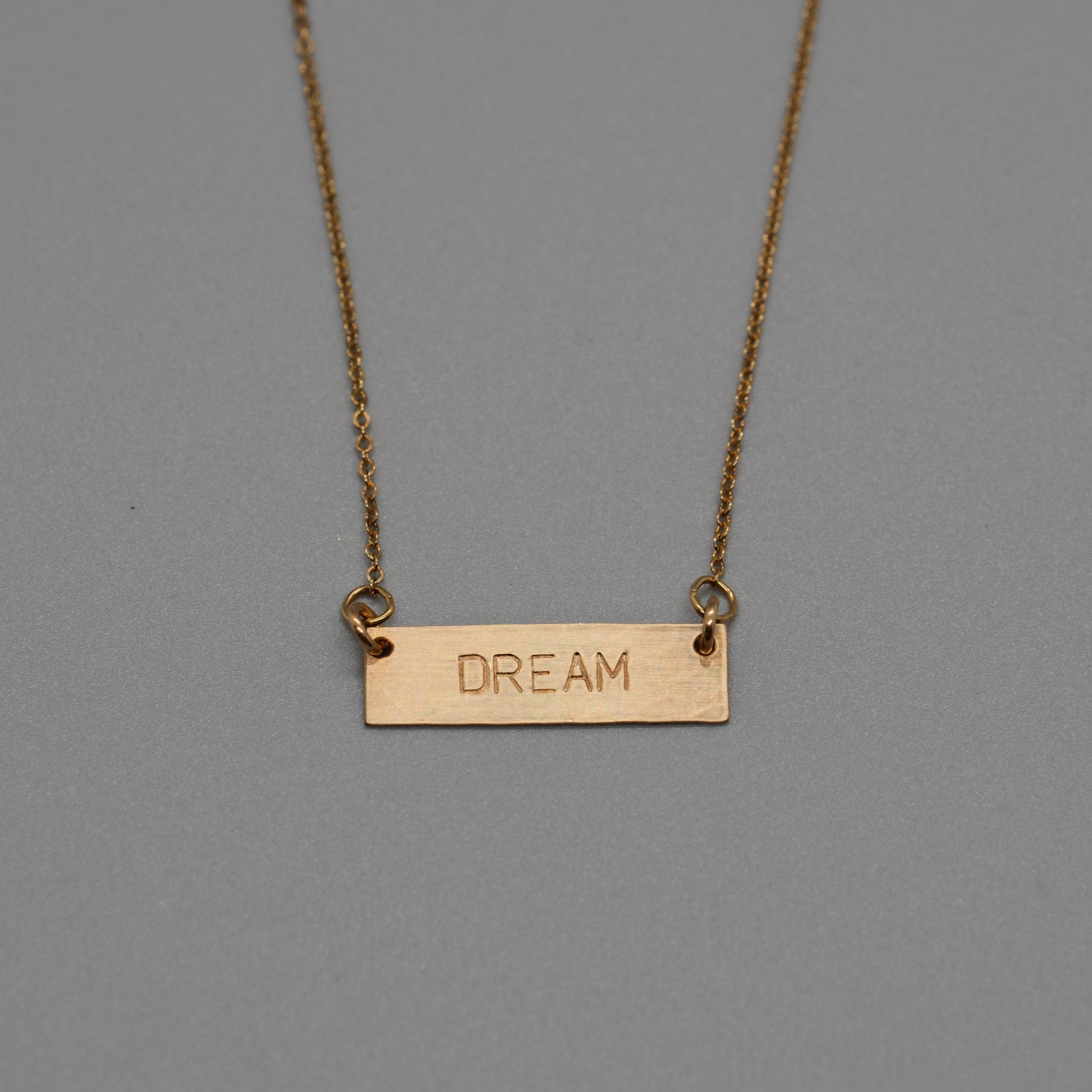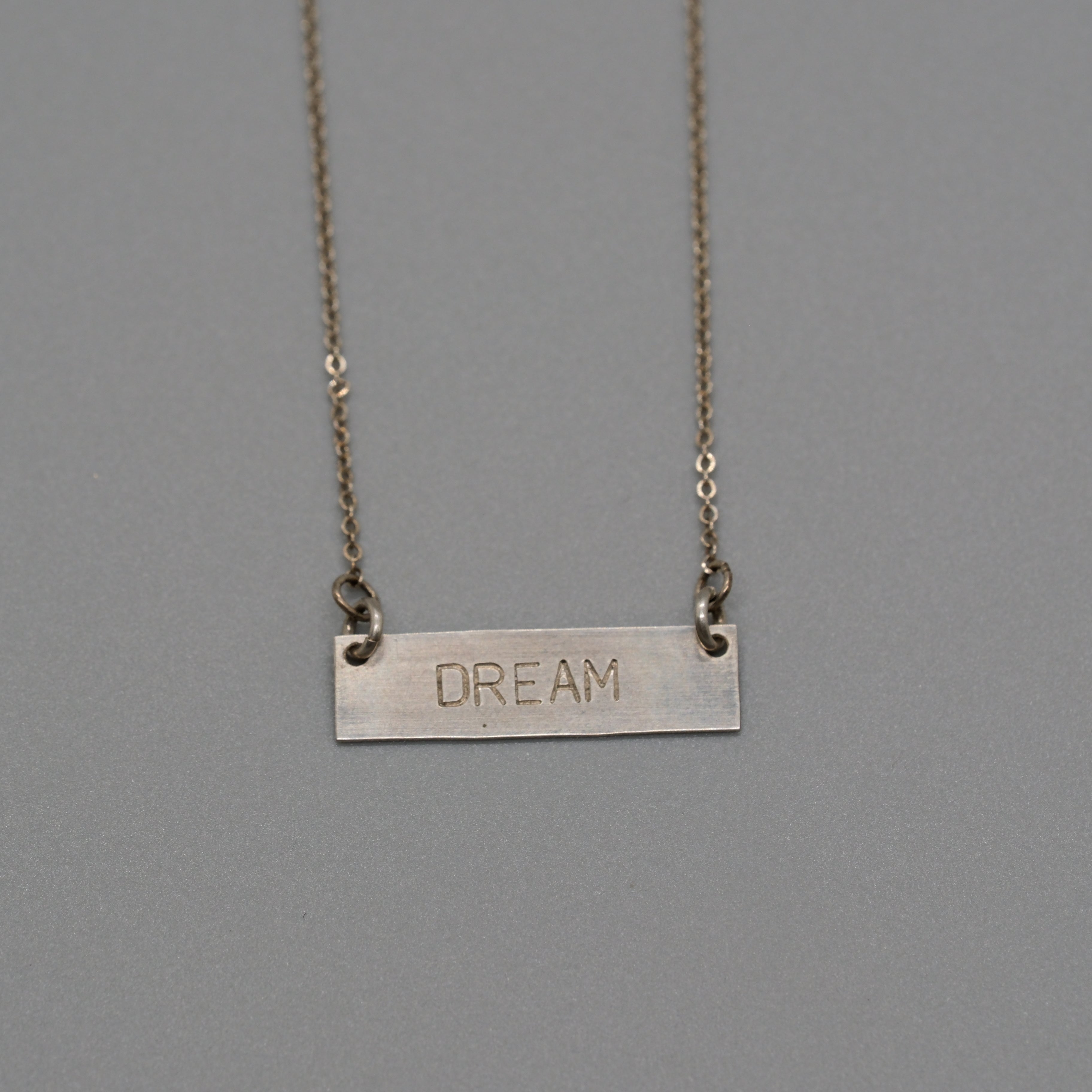 A timeless keepsake, this minimalist bar necklace features a sleek rectangular pendant engraved with "dream" and suspended from a delicate sterling silver chain. Simple, elegant, and sentimental, perfect for everyday wear
