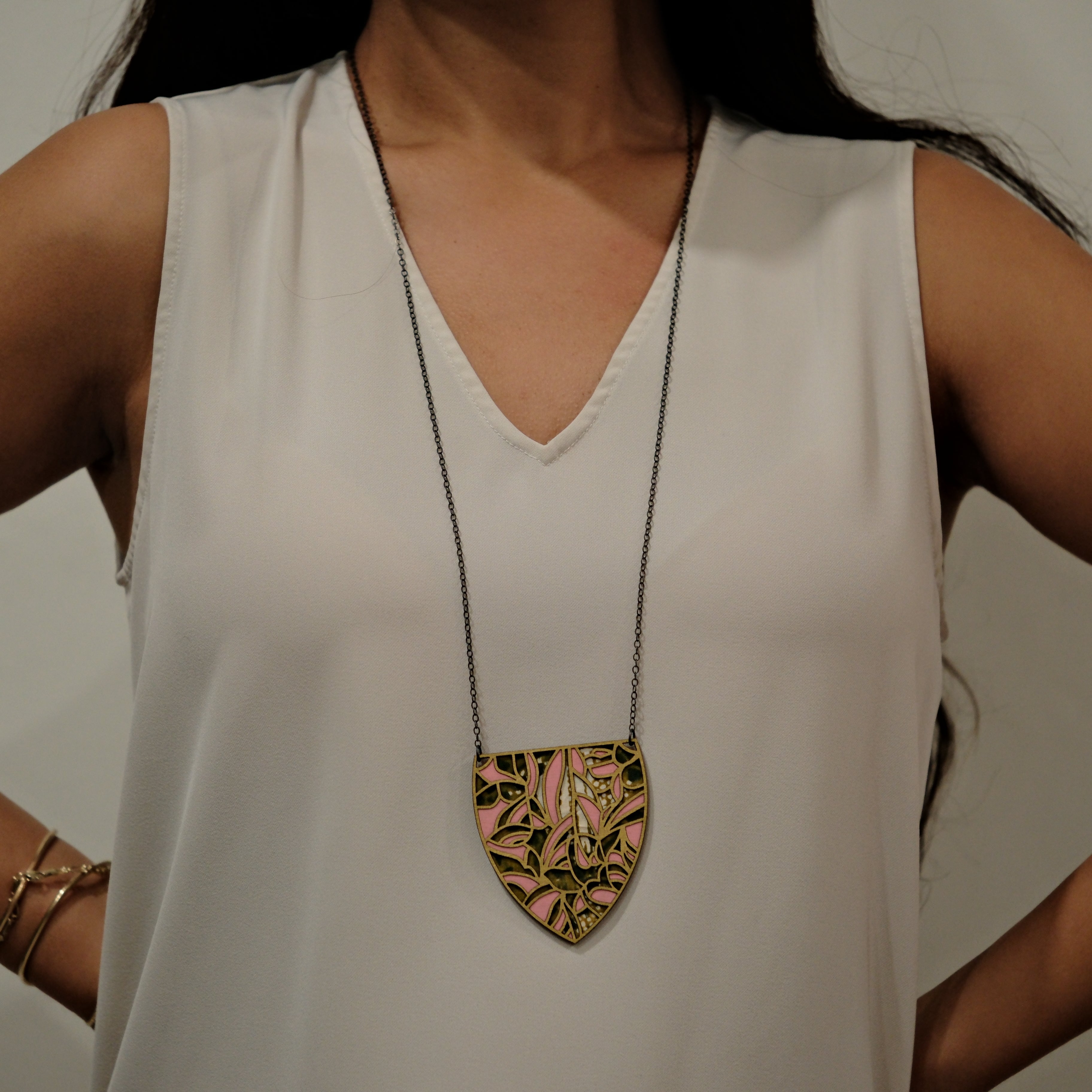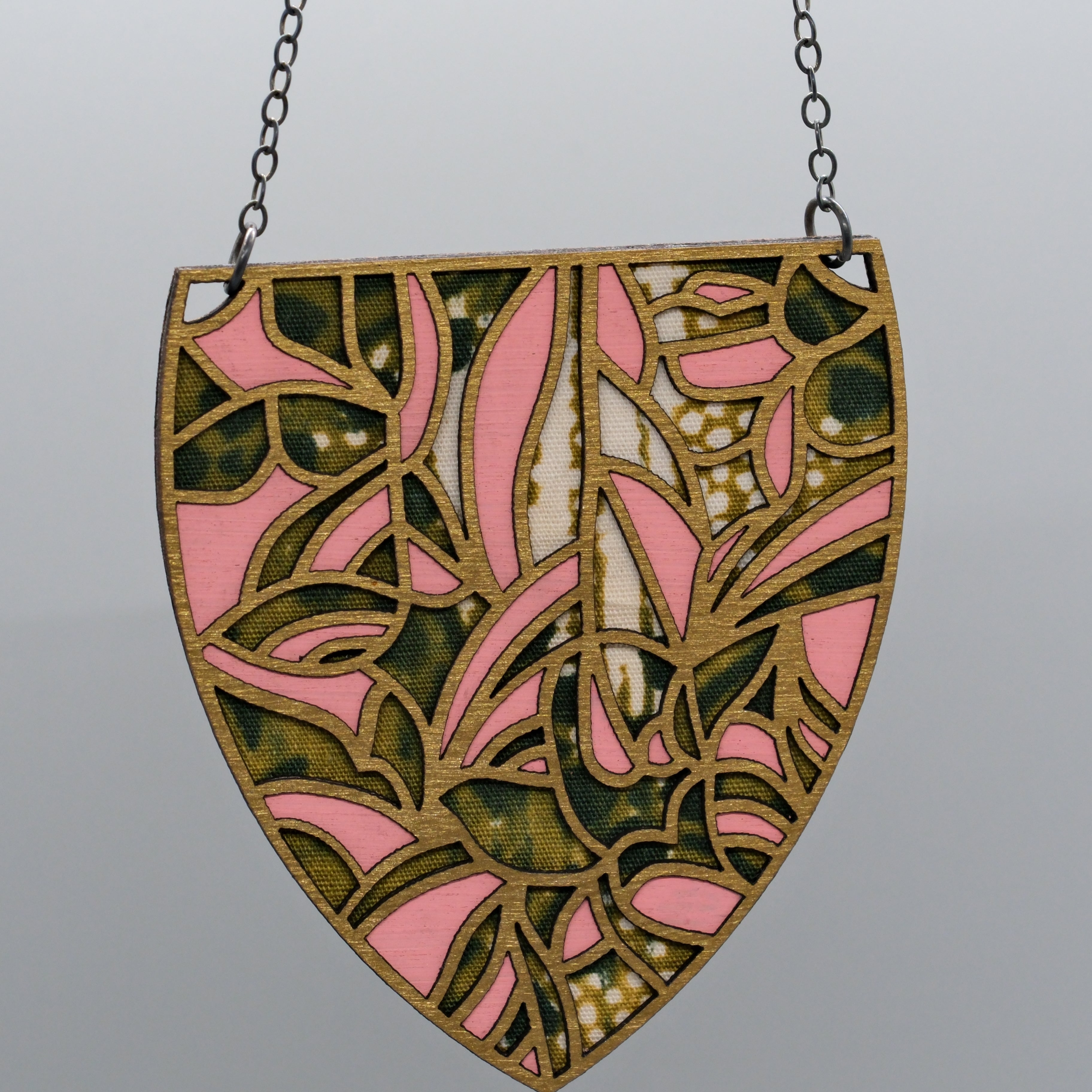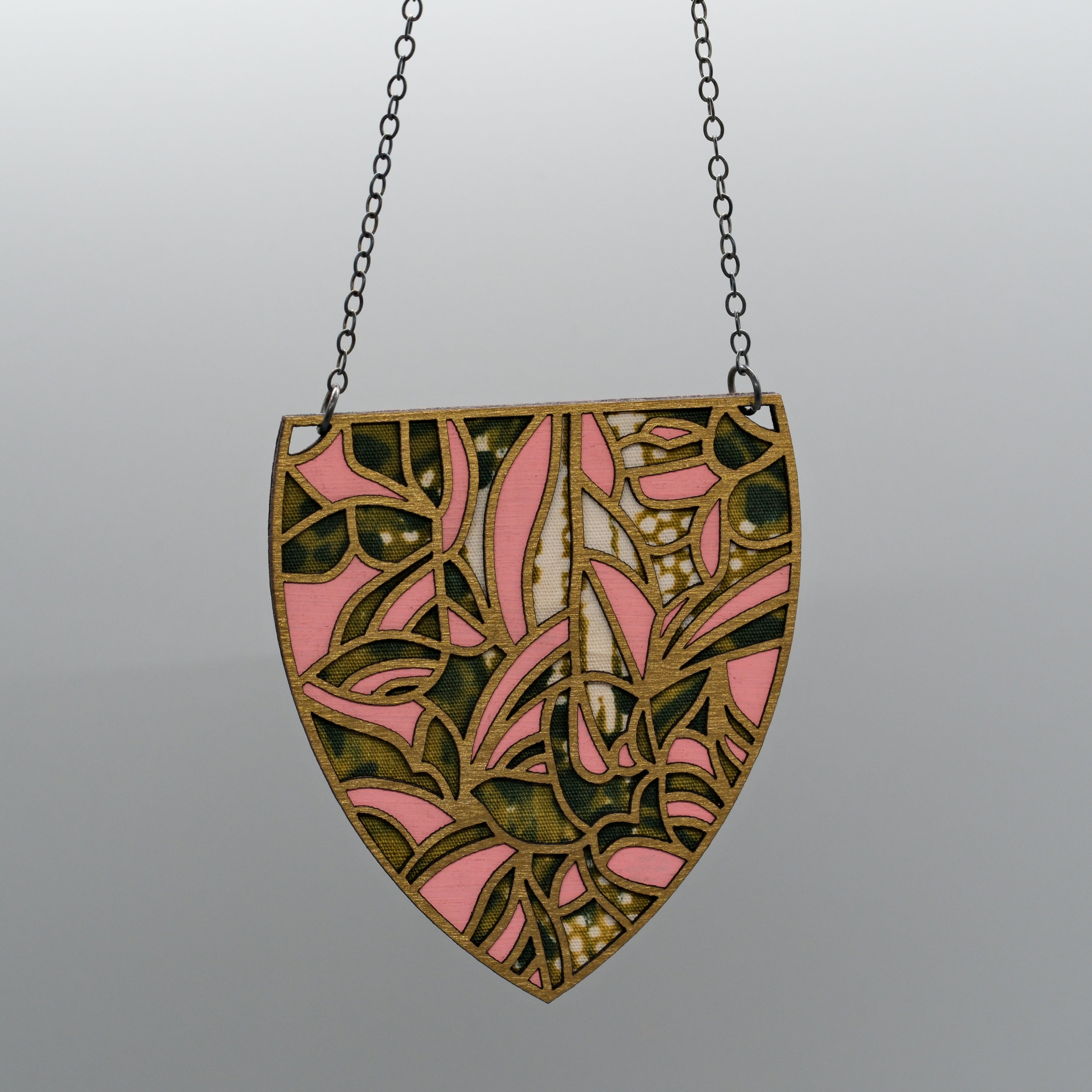 This handcrafted pendant blends modern precision with timeless tradition. Made from sustainably sourced birch wood, the shield-shaped piece is intricately laser-cut to reveal flowing organic patterns inspired by nature. Beneath the delicate woodwork rests a layer of authentic vintage kimono fabric, adding rich texture and warm earthy tones that make every necklace truly one-of-a-kind.
