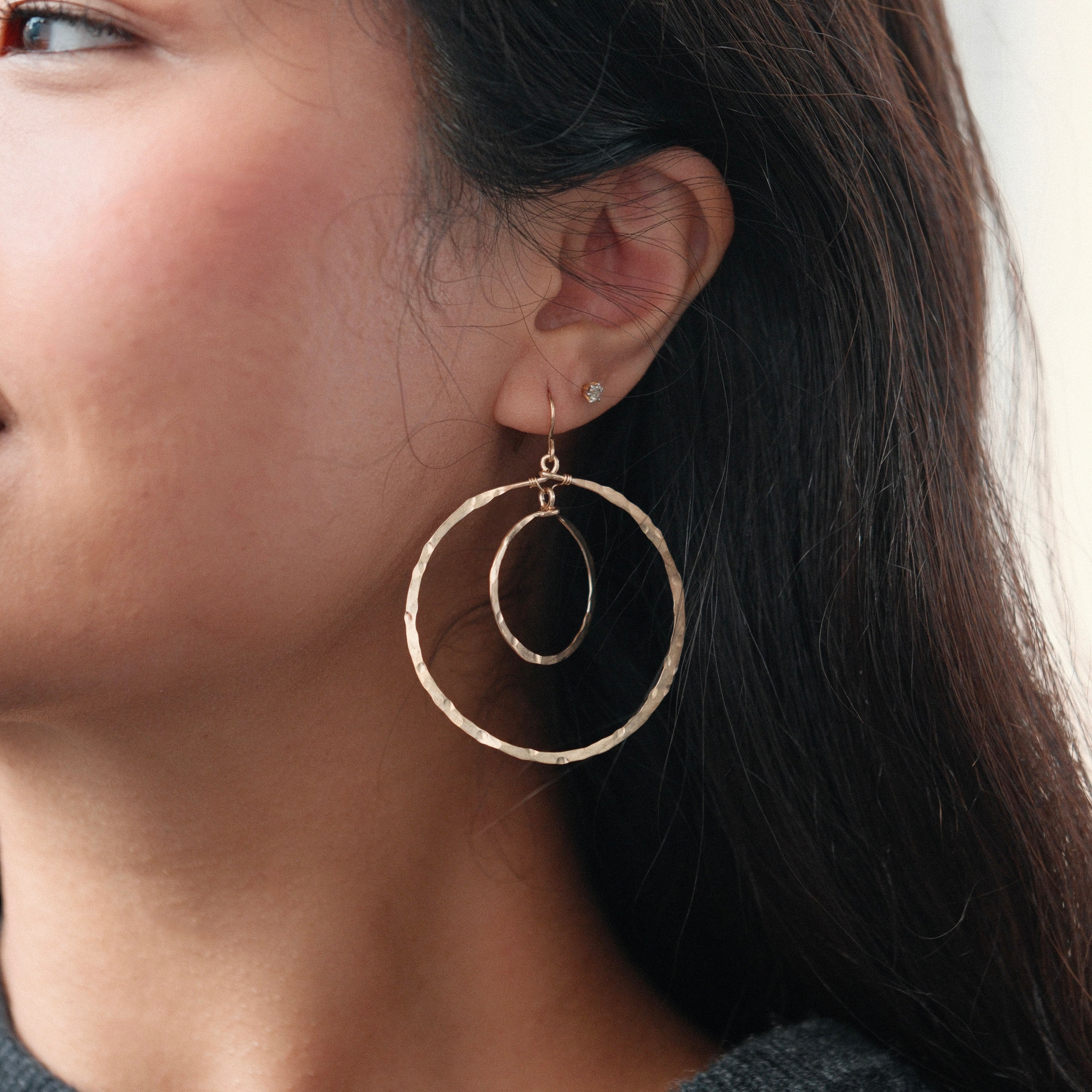 Bold yet beautifully balanced, these 14k gold-filled with sterling silver double hoop earrings make an effortless statement. Hand-hammered for a shimmering, textured finish, each earring features two lightweight open circles that move gracefully with every step. Despite their eye-catching size, they feel incredibly light and comfortable for all-day wear. Modern, artistic, and full of golden glow, they’re the perfect pair to elevate both everyday outfits and special occasions.