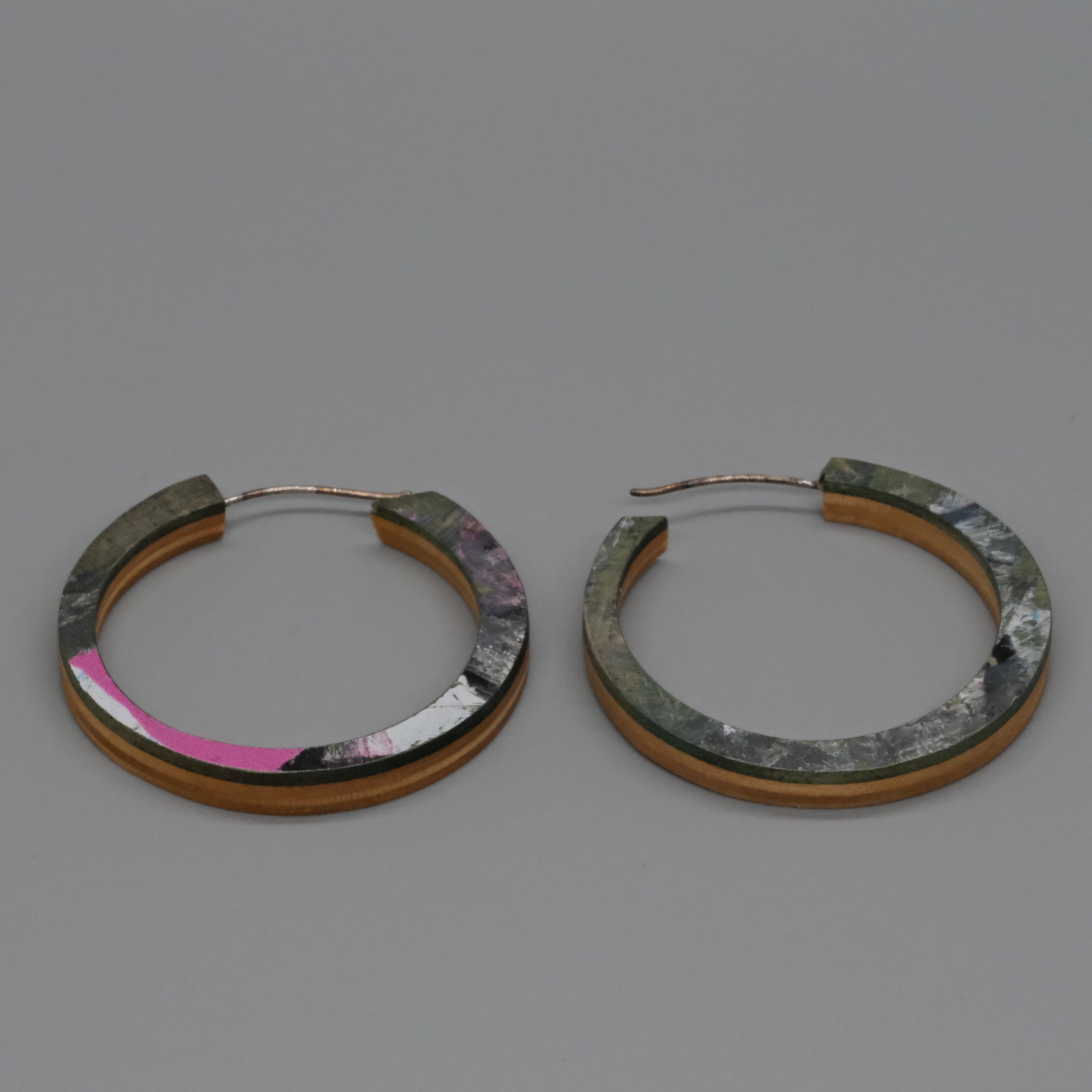 Minimalist with an artsy twist, these slim open hoops are crafted from recycled skateboard wood, showcasing the natural layered edges and unique grain of the board. One hoop displays the original skateboard graphics with bold accents of pink, white, and slate tones, while the other is left natural for a clean, modern contrast. Together they create a subtly mismatched pair that feels intentional, contemporary, and truly one-of-a-kind.